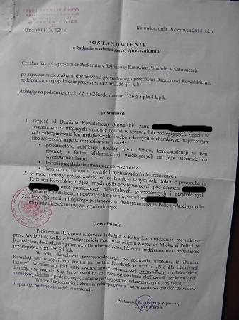 23 lipca policja przeszukała mieszkanie Damiana Kowalskiego, twórcy strony „Nie dla islamizacji Europy” (strona internetowa oraz profil na FB z ilością 150 000 fanów). Funkcjonariusze zarekwirowali telefon komórkowy, kartę SIM oraz komputer stacjonarny. Czynności te wykonano w ramach postępowania prokuratorskiego prowadzonego od 16 czerwca w związku z podejrzeniem o popełnienie przestępstwa z art. 256 § 1 (Kto publicznie propaguje faszystowski lub inny totalitarny ustrój państwa lub nawołuje do nienawiści na tle różnic narodowościowych, etnicznych, rasowych, wyznaniowych albo ze względu na bezwyznaniowość, podlega…). Nakaz przeszukania wydał prok. Czesław Kurpiś.